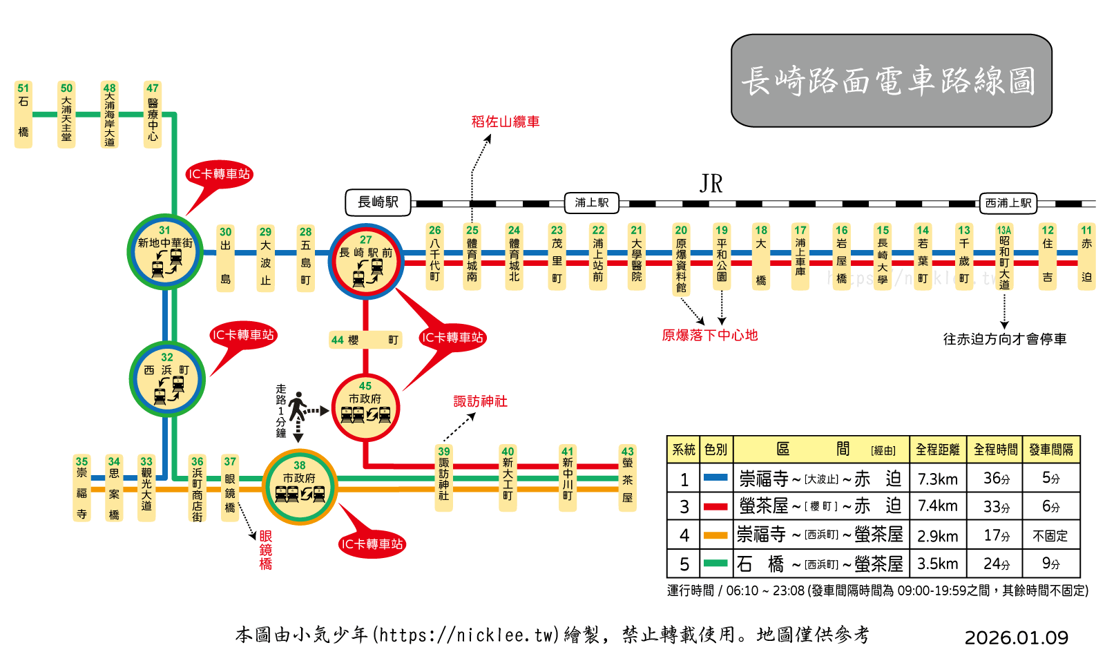 看官網的最新路線圖,可以在長崎車站、市役所、新地中華街、西浜町這四個站轉車了
