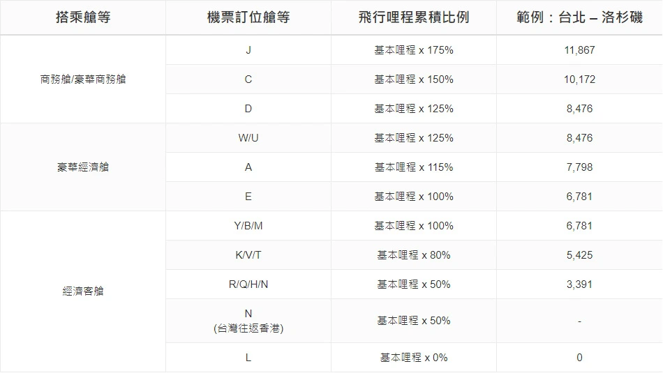 每個艙等又可分成不同的訂位代號,不同的訂位代號,搭機後,獲得的哩程也不同