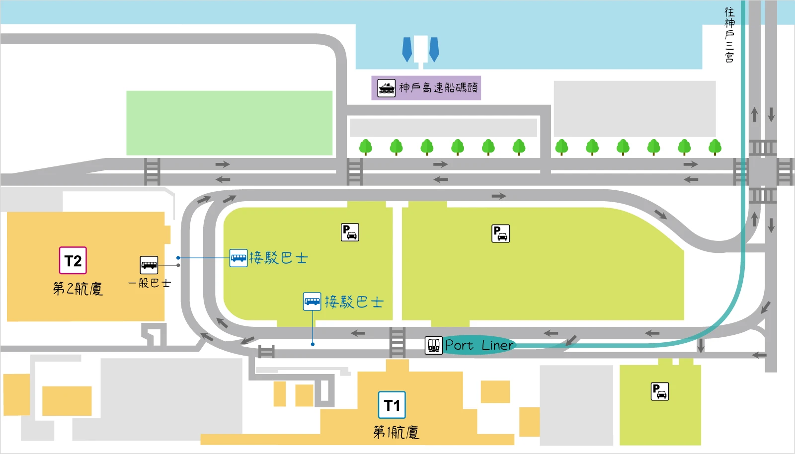 神戶機場對外交通很多,以下僅列出比較有可能使用到的路線與交通工具